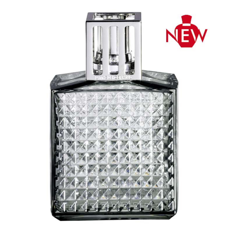 con un toque Art Déco, vidrio translúcido con motivos de diamante, elegante tapa cuadrada plateada