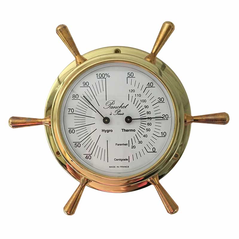 Higrómetro y Termómetro análogos en latón con forma de timón.