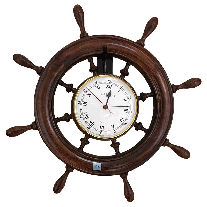 Reloj con madera barnizada en forma de timón, arillo en latón