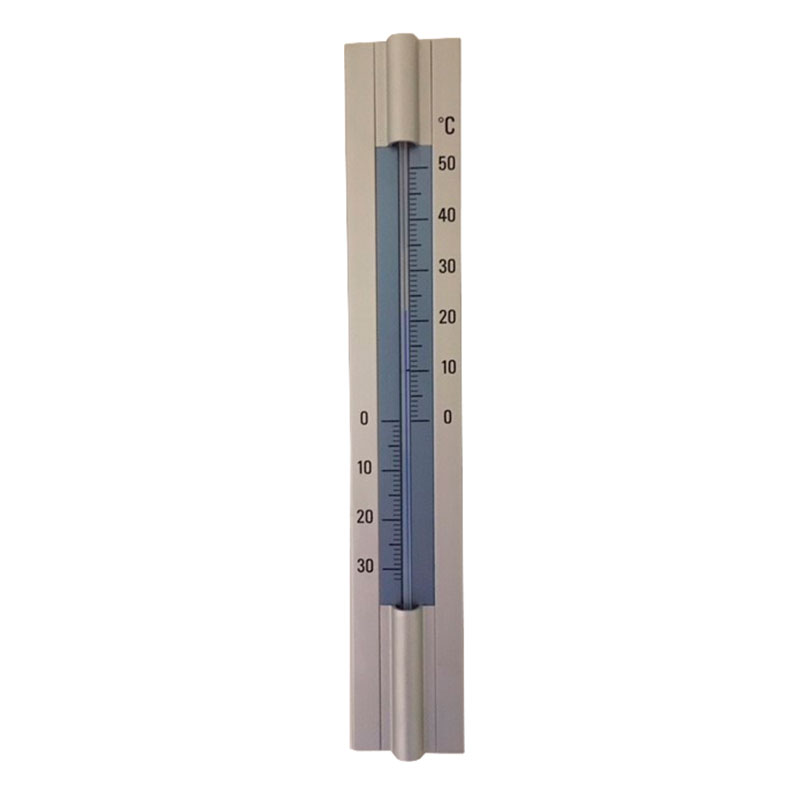 Termómetro de aluminio plateado con azul, líquido alcohol.