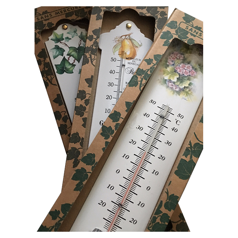 Termómetros de alcohol sobre placa de metal esmaltado.